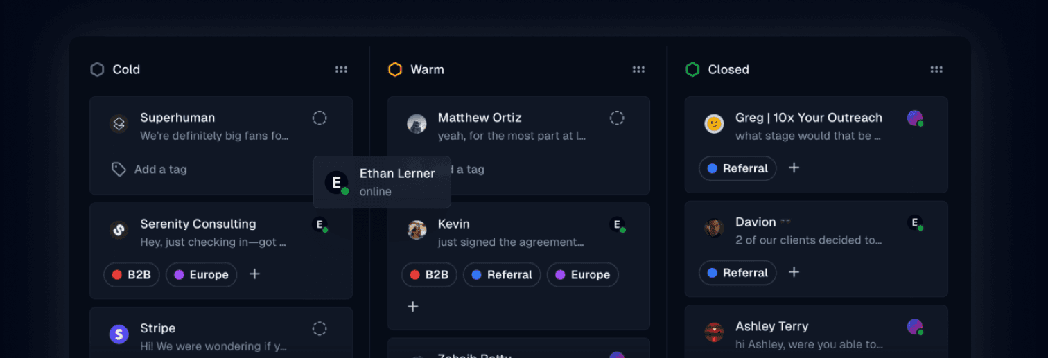 You can also add tags and notes to conversations, so nothing important slips through the cracks. Additionally, Inbox offers a pipeline view, a powerful tool for tracking the status of your prospects.