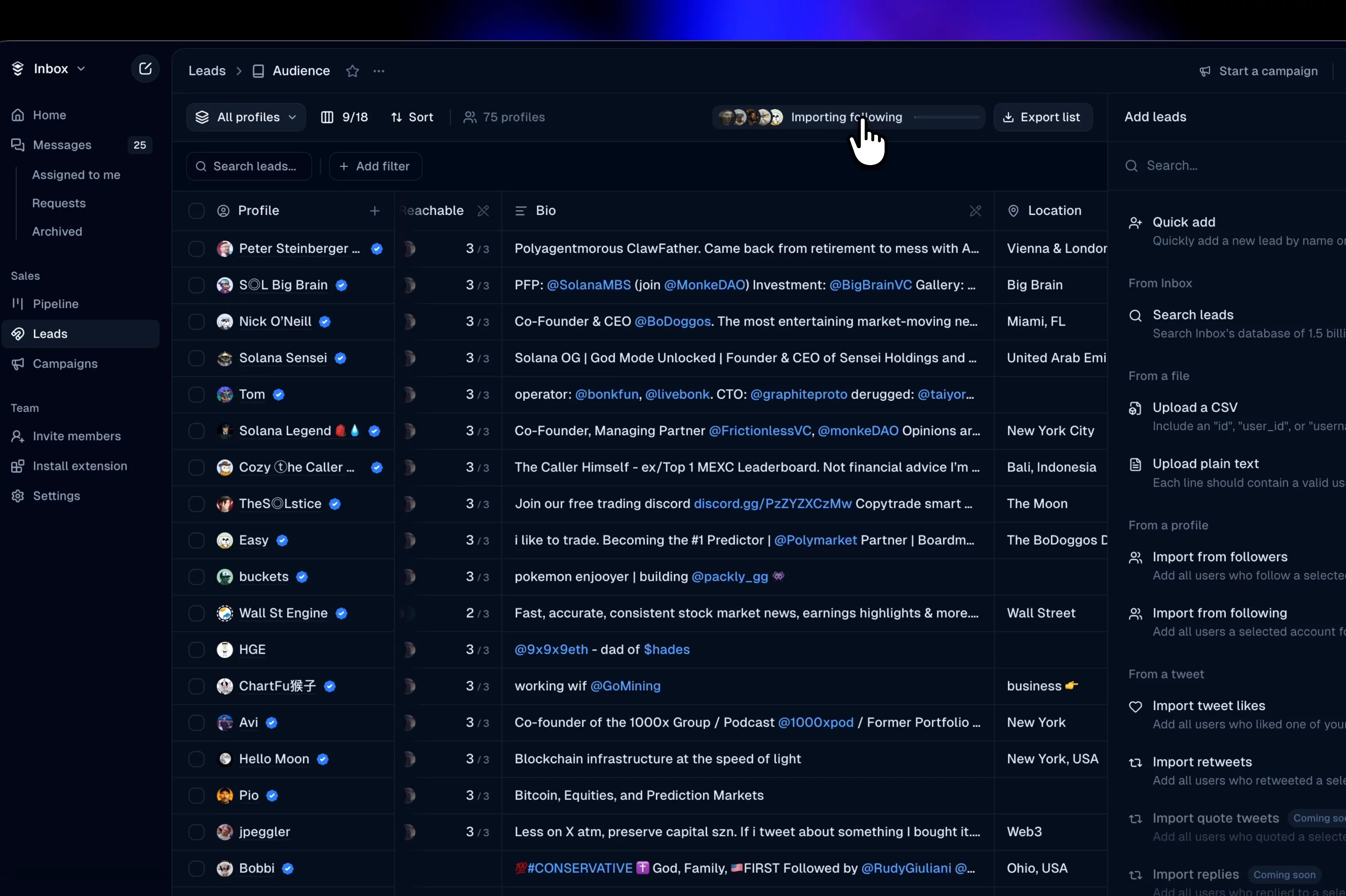 See exactly which of your linked accounts can DM each profile. Every list on the home page also shows its reachable percentage so you know how warm the list is at a glance.
